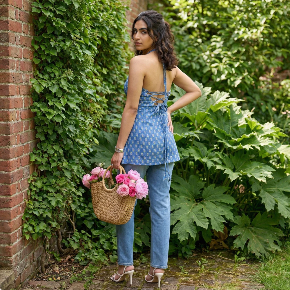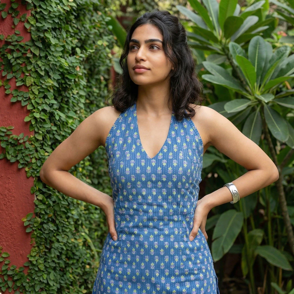 This short kurti features a vibrant blue fabric adorned with intricate white paisley prints, creating an elegant ethnic vibe perfect for casual outings.